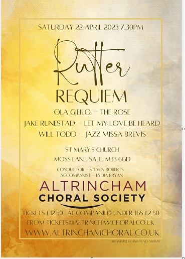 Returning to heavenly song. John Hayes, our bass singer in residence, will be singing with the Altrincham Choral Society in a programme featuring John Rutter’s Requiem.