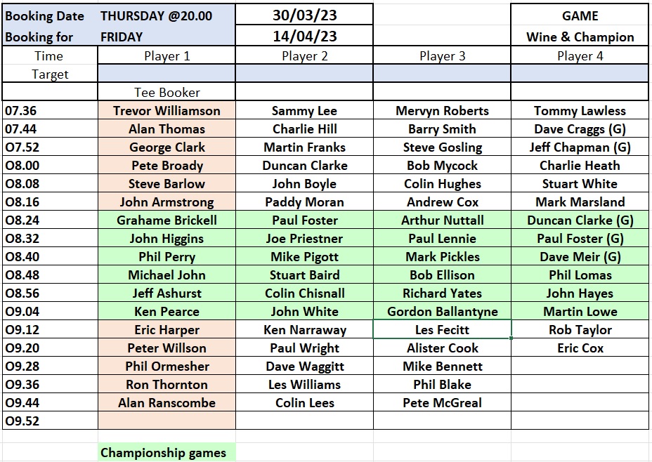 This is the tee booking schedule for 14th April, which is the date of the 2022 Senior Championship, postponed from last year. The Championship slots run fron 08:24 to 09:04