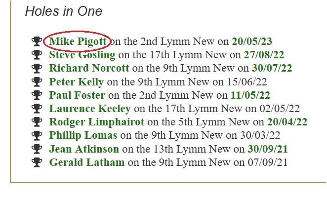 And well done to Mike Pigott, who also had a good day on Saturday. Mike has usurped our own Steve Gosling from the top of the Hole-in-One list, a position that Steve had held since last August: