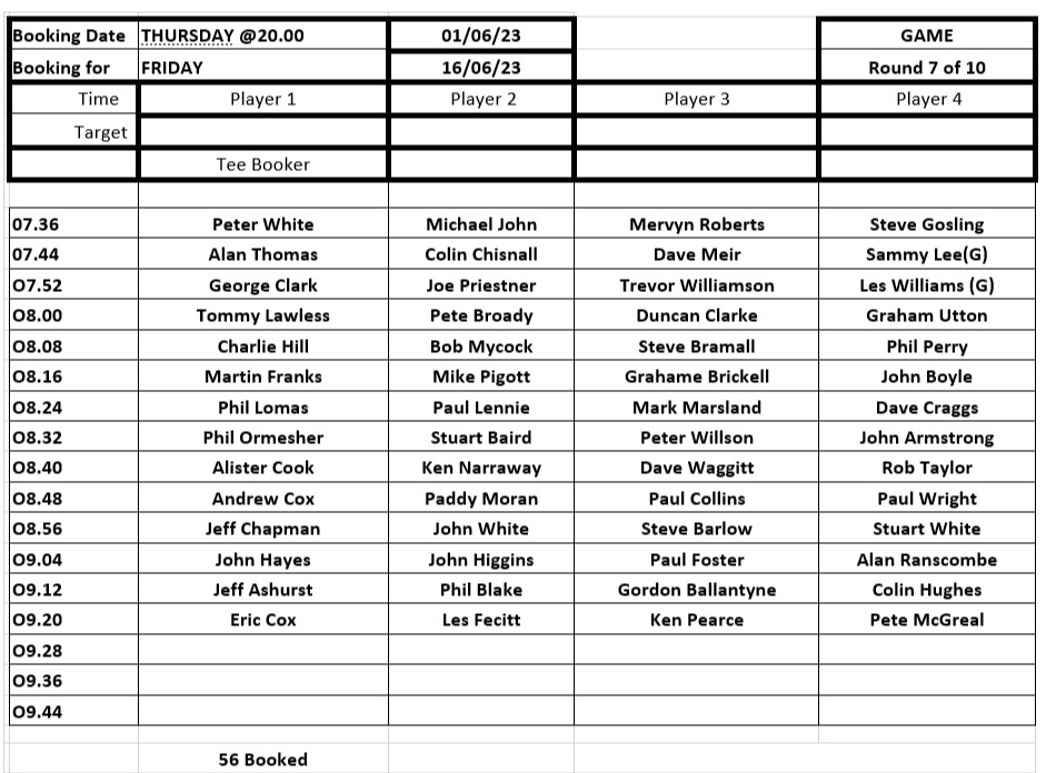 This is the tee booking schedule for play on Friday 16th June, Round 7 of 10 of the summer league. If your name is in the left column, please book for your group.