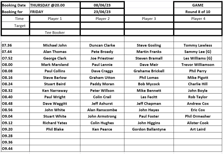 This is the tee booking schedule for play on Friday 23rd June, Round 8 of 10 of the summer league. If your name is in the left column, please book for your group.