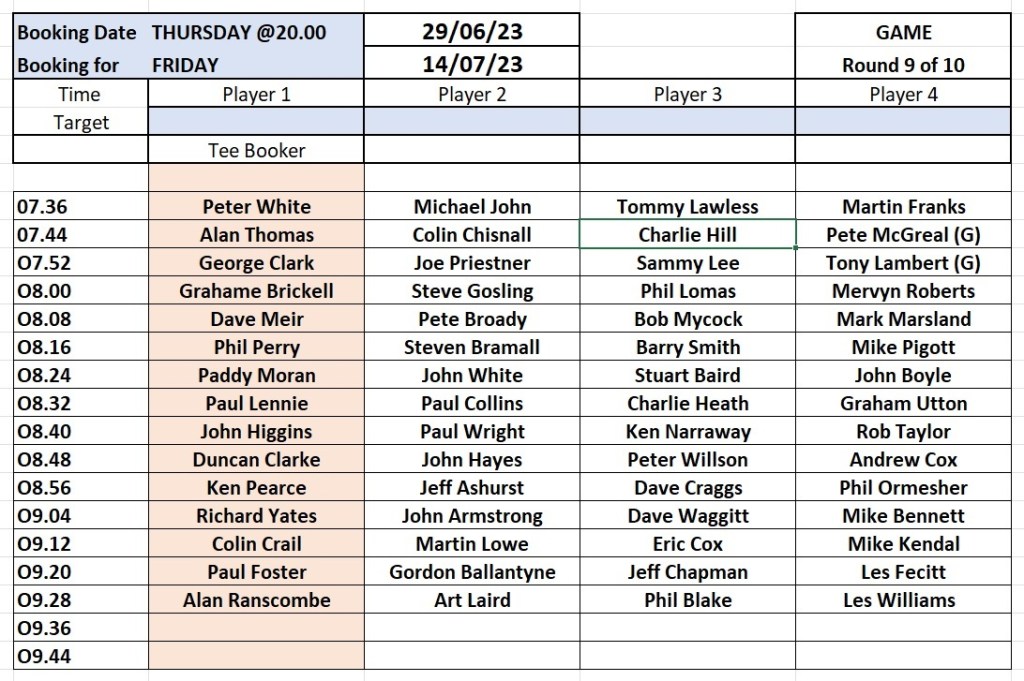 This is the tee booking schedule for play on Friday 14th July, Round 9 of 10 of the summer league. If your name is in the left column, please book for your group.