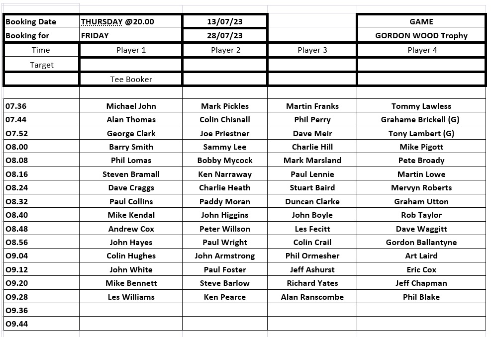This is the tee booking schedule for play on Friday 28th July. If your name is in the left column, please book for your group.
