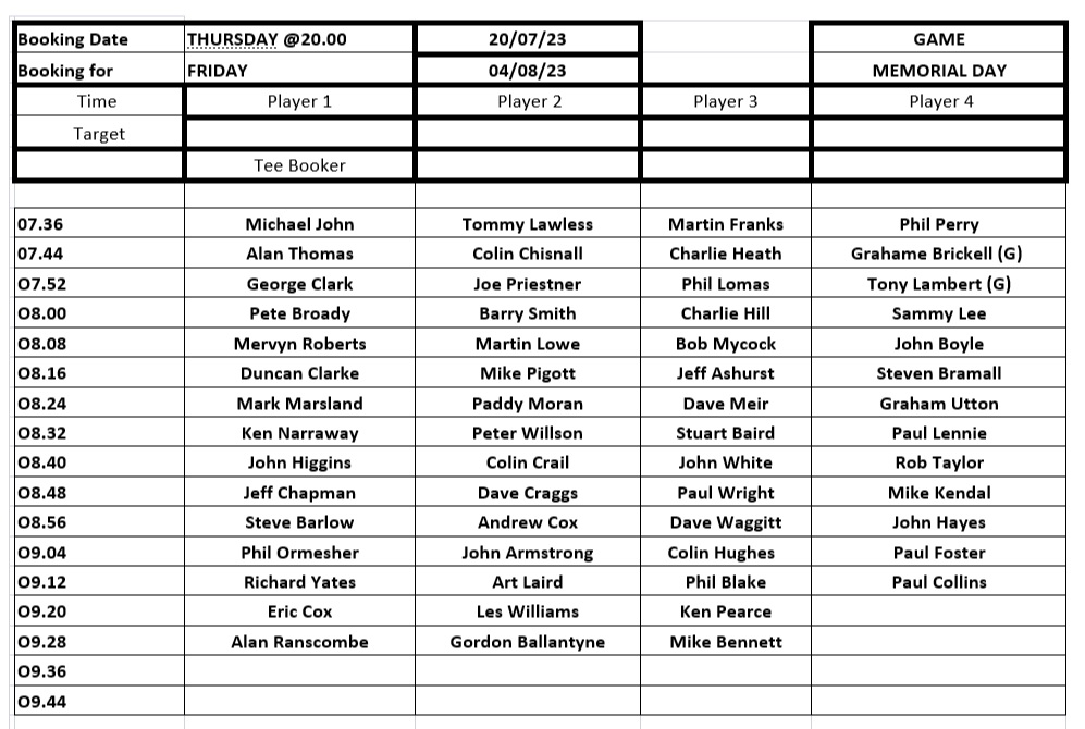This is the tee booking schedule for play on Friday 4th August. The competition will be our Memorial Day game.