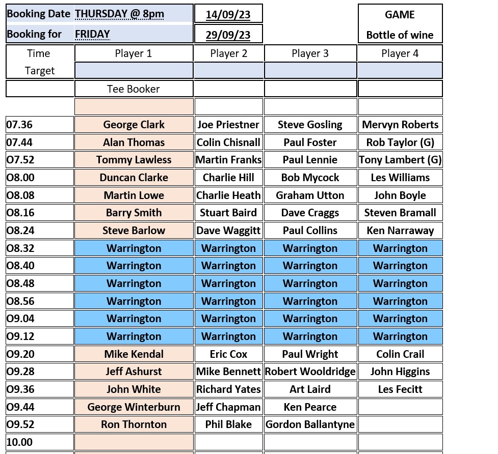 This is the tee booking schedule for play on Friday 29nd September. We have a home match against Warrington. The rest of the field plays for a bottle of wine.
