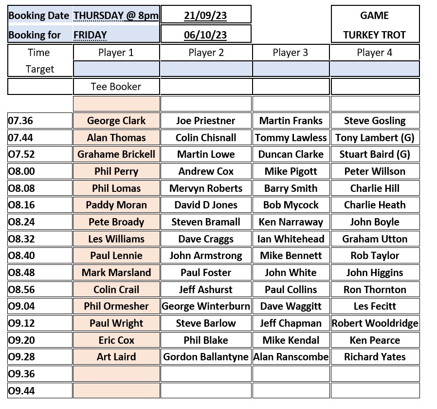 This is the tee booking schedule for play on 6 October: our annual Turkey Trot.