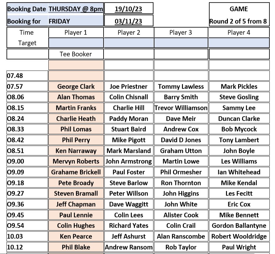 This is the tee booking schedule for play on 3rd November: Round 2 of best 5 from 8