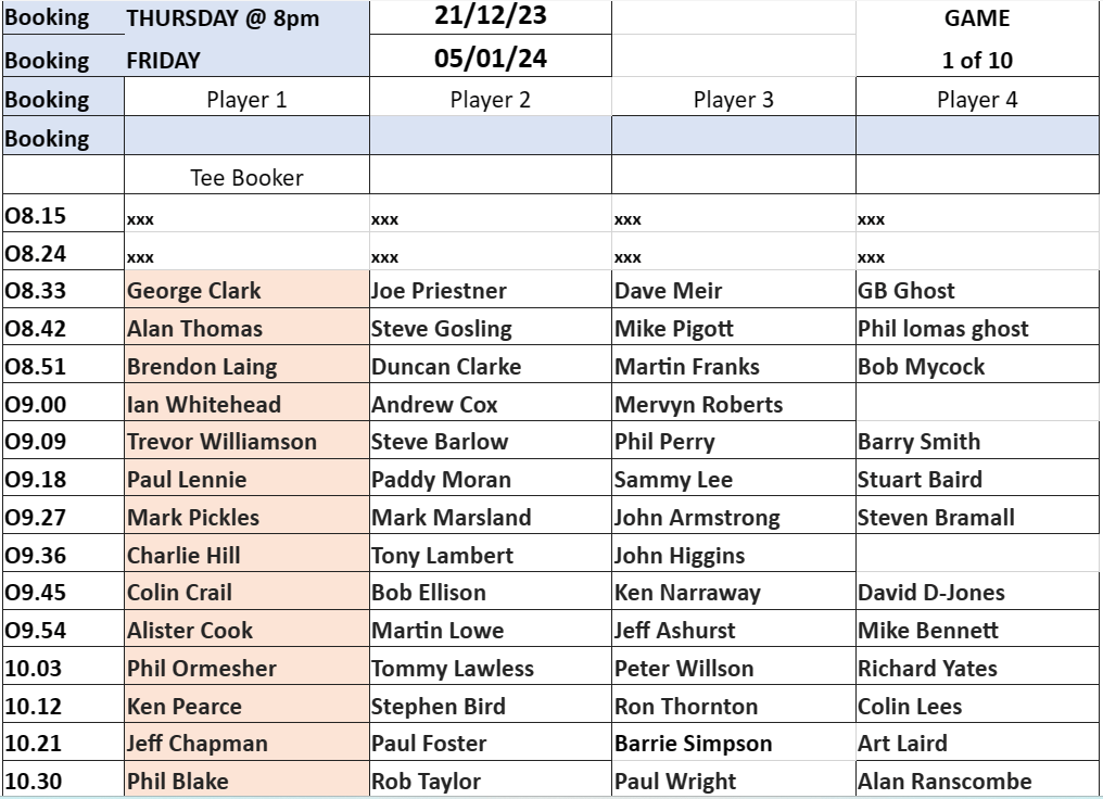 Tee Booking schedule for tomorrow (21 December) for play on 5th January 2024