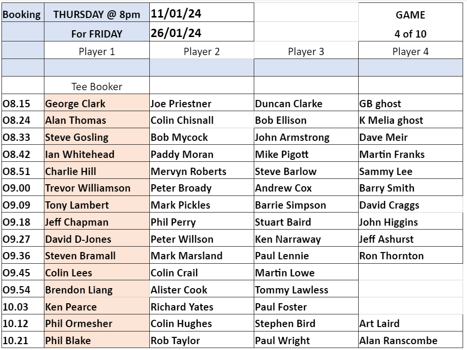 Tee Booking Schedule for tomorrow (Thursday 11 Jan)