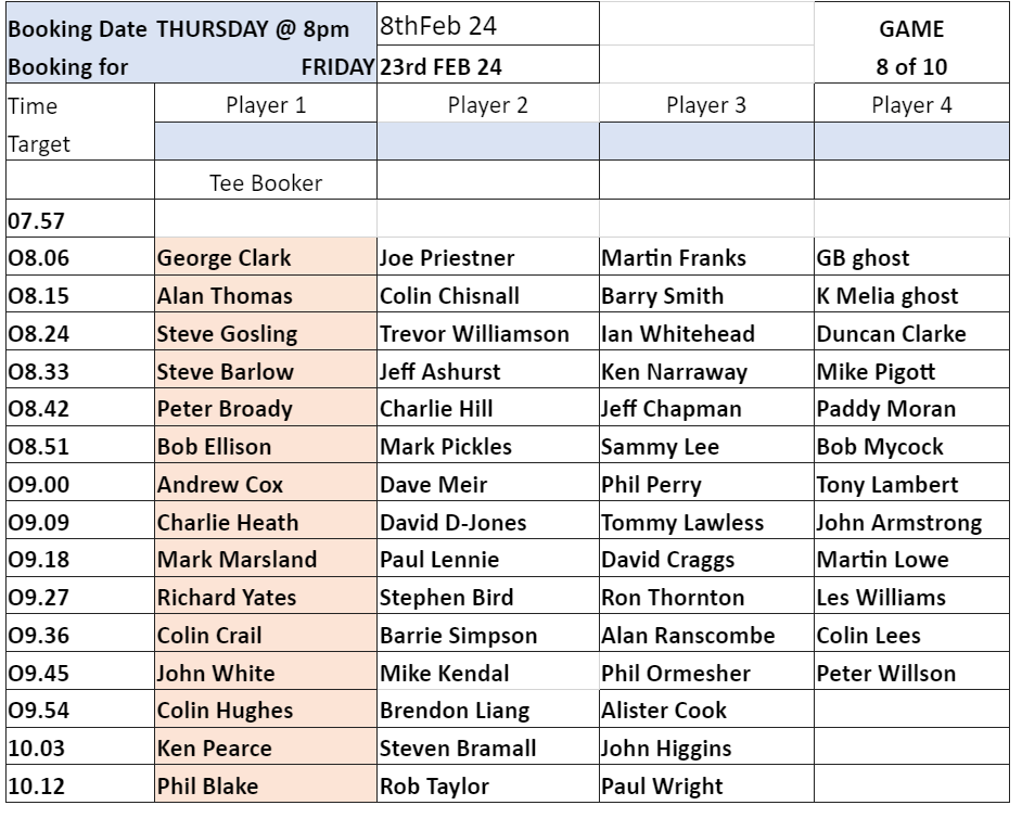 Tee-booking schedule for tomorrow (Thursday 8 Feb)