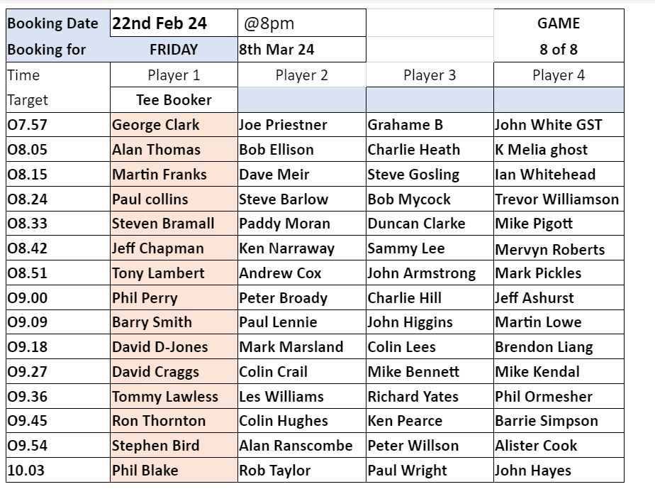 Tee Booking Schedule for Tomorrow (22 Feb)