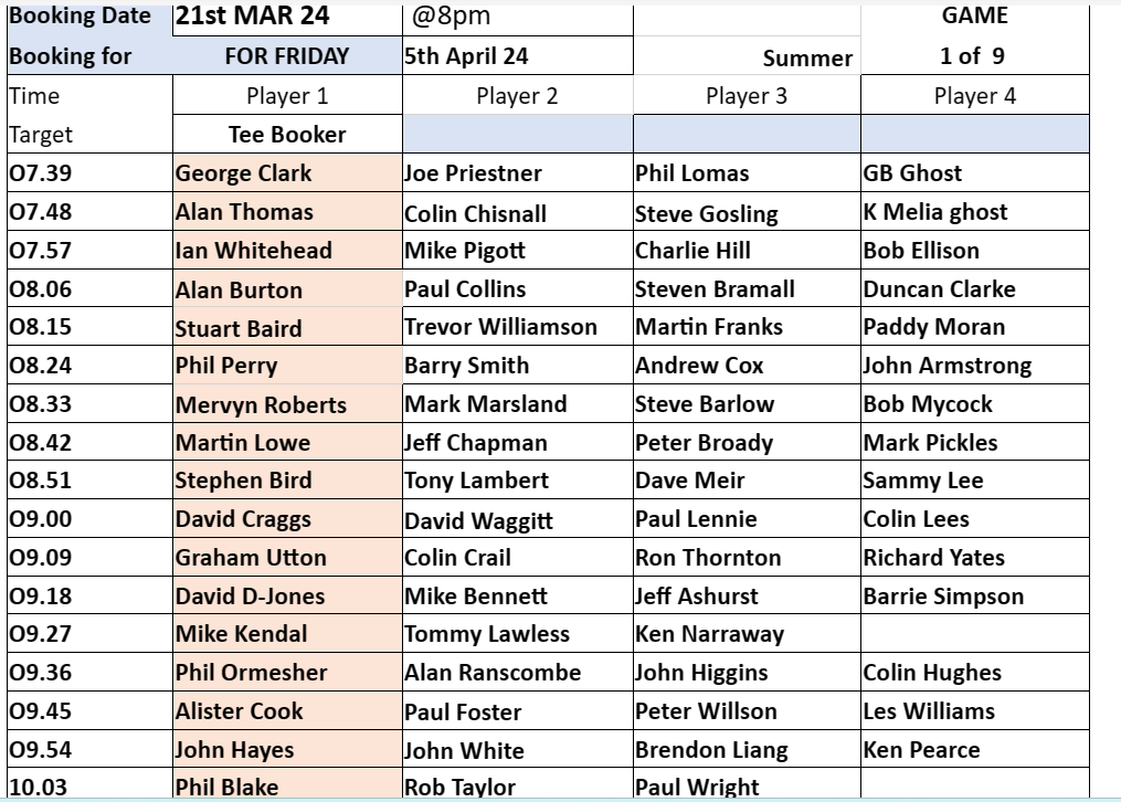 Tee-booking Schedule for Tomorrow (Thursday 21 March)