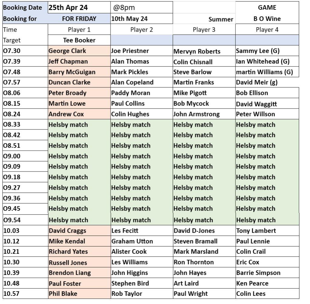 Tee Booking Schedule for Tomorrow (Thursday 25 April)