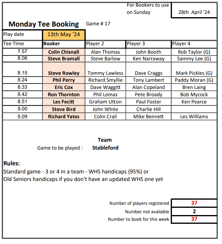 Tee Booking Schedule for Happy Mondays – Sunday 28 April
