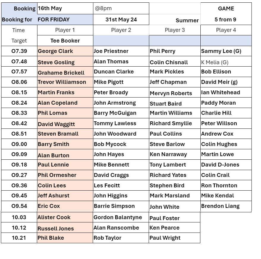 Tee-booking Schedule for tomorrow (Thursday 16 June)