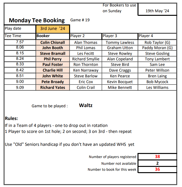 Happy Mondays Tee-Booking Schedule for Sunday 19th May