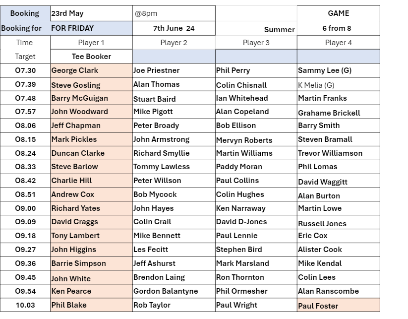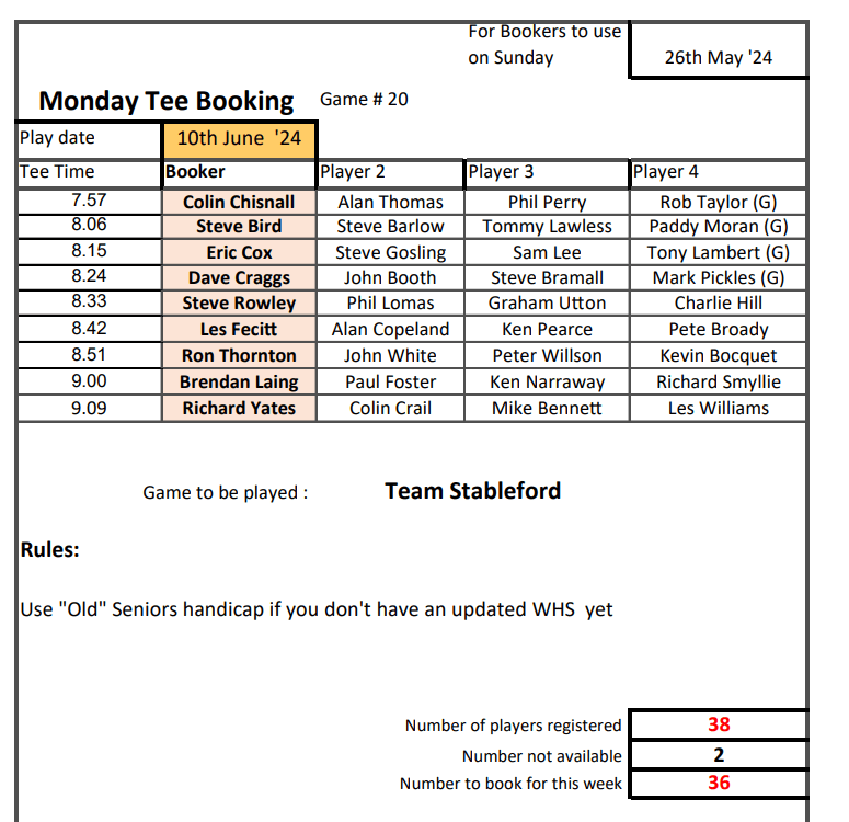 Tee-booking schedule for tomorrow (Thursday 23 May)