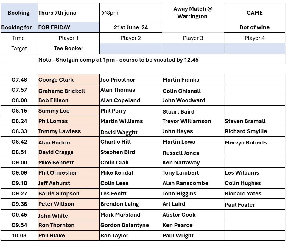 Tee-booking schedule for tomorrow (Thursday 6 June)