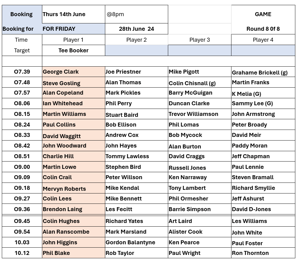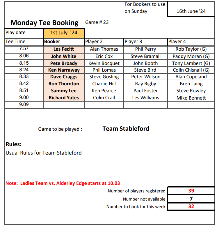 Tee-booking schedule for tomorrow, Thursday 13 June