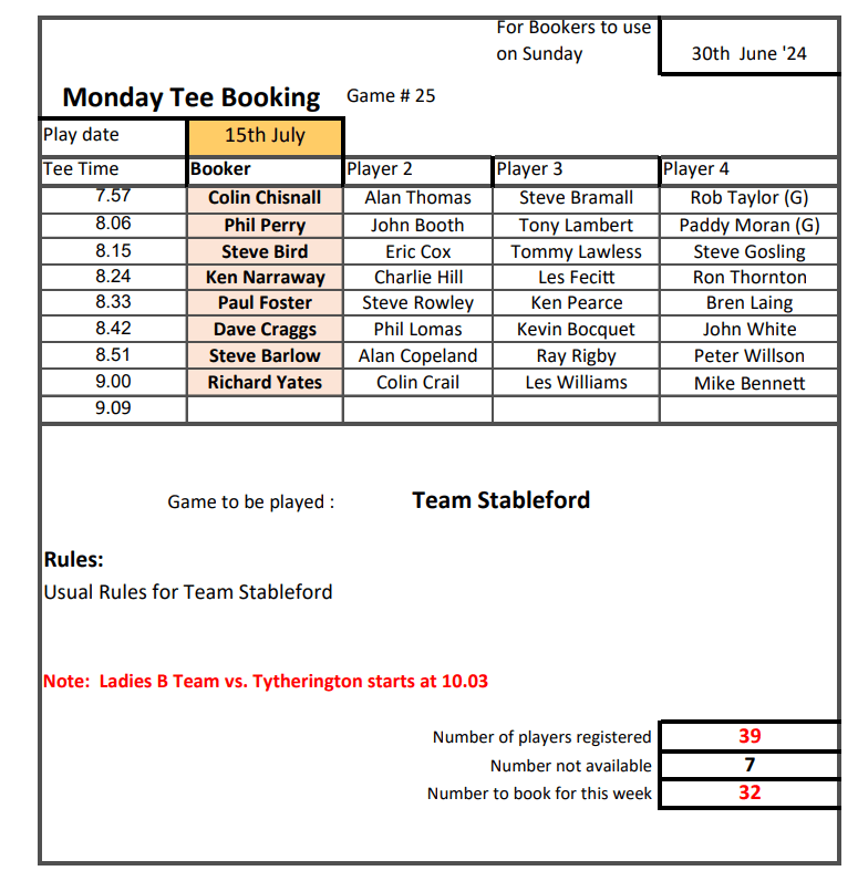 Please remember, before every Thursday evening, to see the weekly draw sheet to see if you have been nominated as a tee booker, or to see what time you should be booked in for.