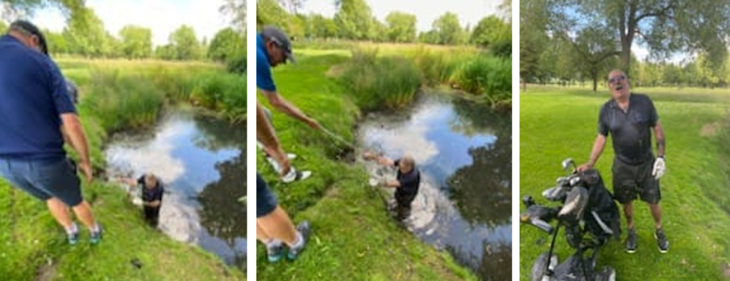 Dave Meir ran back to the pond, to see Phil ‘almost fully submerged and frothing bubbles’. Dave offered Phil a 5 iron, and managed to pull him to dry land.