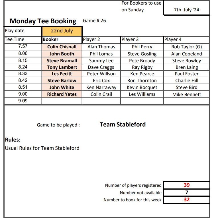 Happy Mondays Tee-Booking Schedule (on Sunday 7th July)