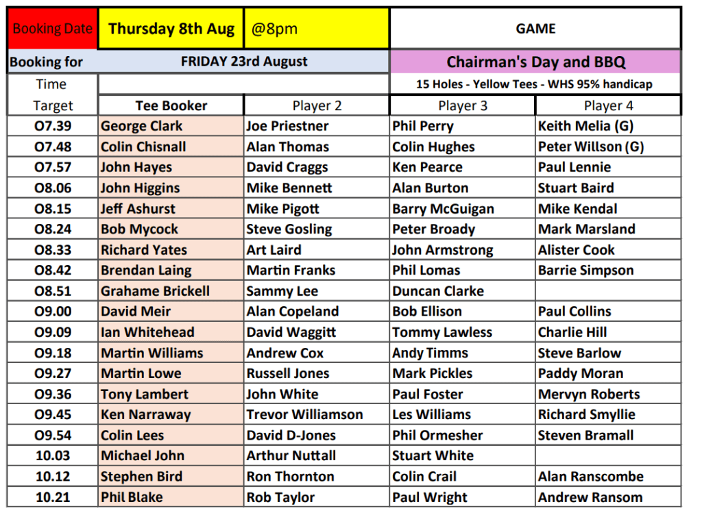 Tomorrow we book the tees for Friday 23 August, which is Chairman’s Day and BBQ, organised by our outgoing chairman, Mike Bennett.