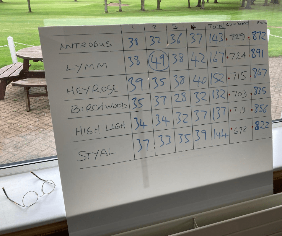 The final Tatton match took place at Lymm, yesterday, Tuesday 10th September on a blustery cloudy day with spells of heavy rain making conditions very difficult for scoring. However, all four pairs got down to the task in hand, posting 4 fantastic fourballs scores, totalling 167 points. Lymm won the day by 15 shots from Heyrose and picked up 24 points on Antrobus. This meant that Lymm won the Tatton League, for the first time in the club’s history by 19 points from Antrobus who had been holders for the previous two years.