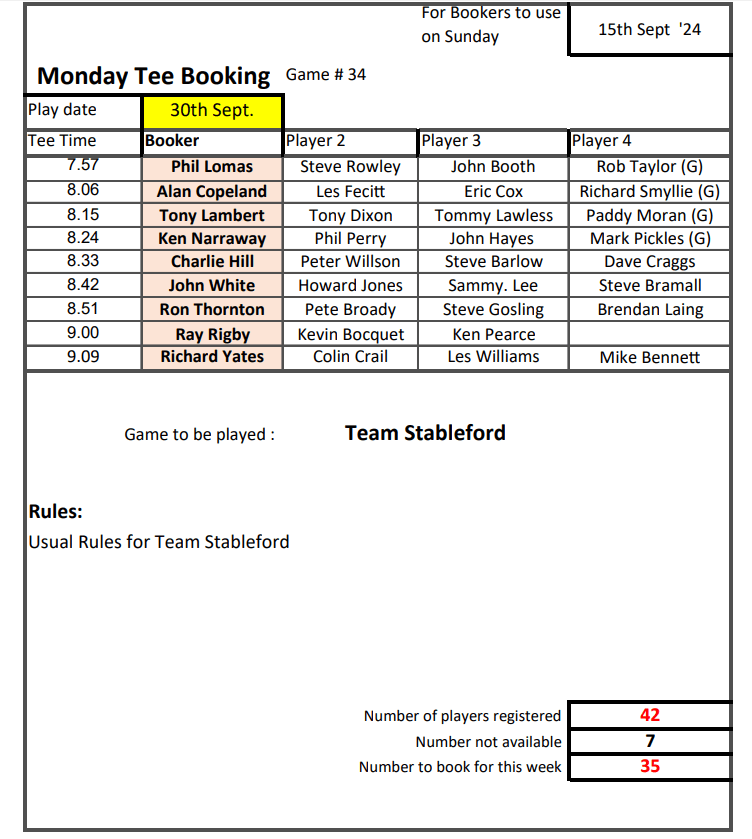 Tee-booking schedule for tomorrow (Thursday 12 September)