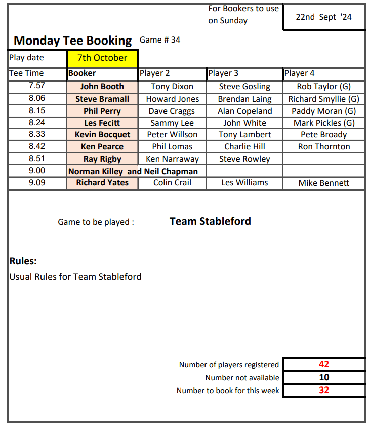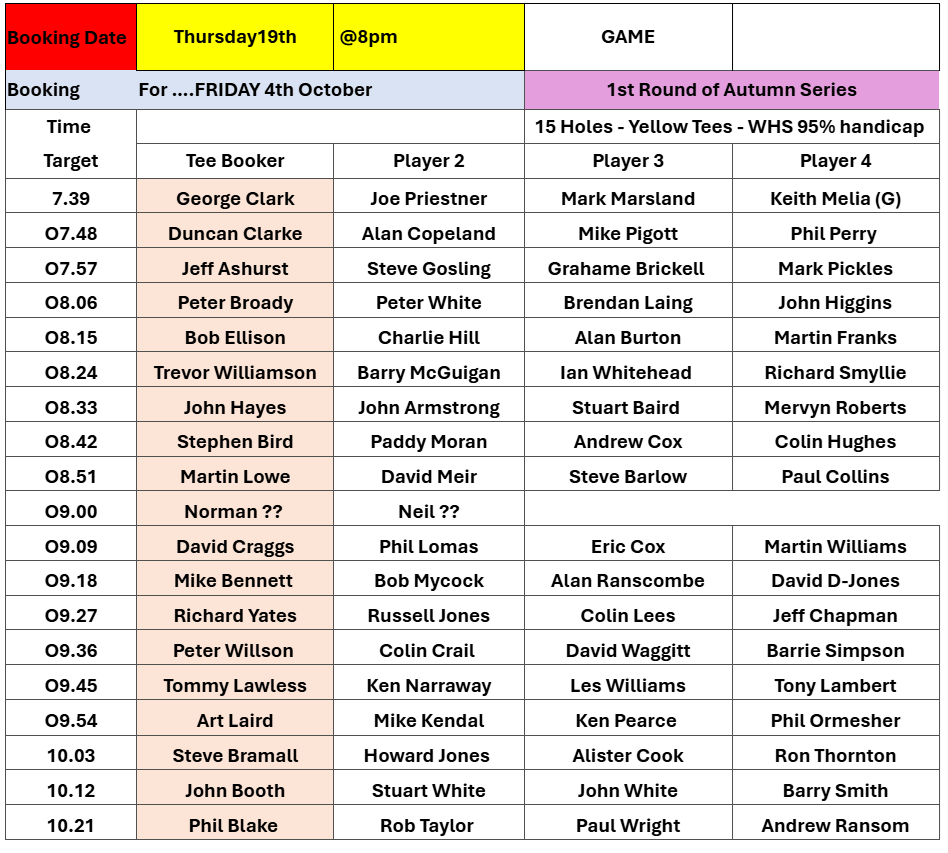 Tee-Booking Schedule for tomorrow: Thursday 19 September