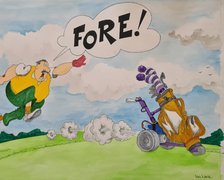 Ian Lane at Leigh GC is a talented cartoonist, who remembered Phil Lomas becoming totally submerged in a pond when trying to save his runaway trolley. Ian sent this image to us. I’m not sure if it resembles Phil, but at least Ian remembered the big moustache!