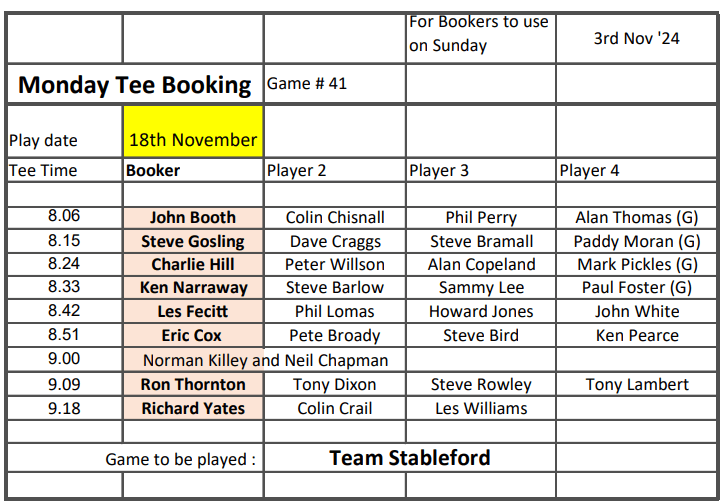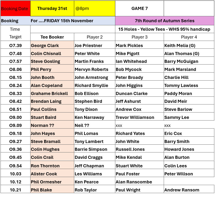 Tee-booking schedule for tomorrow – Thursday 31 October