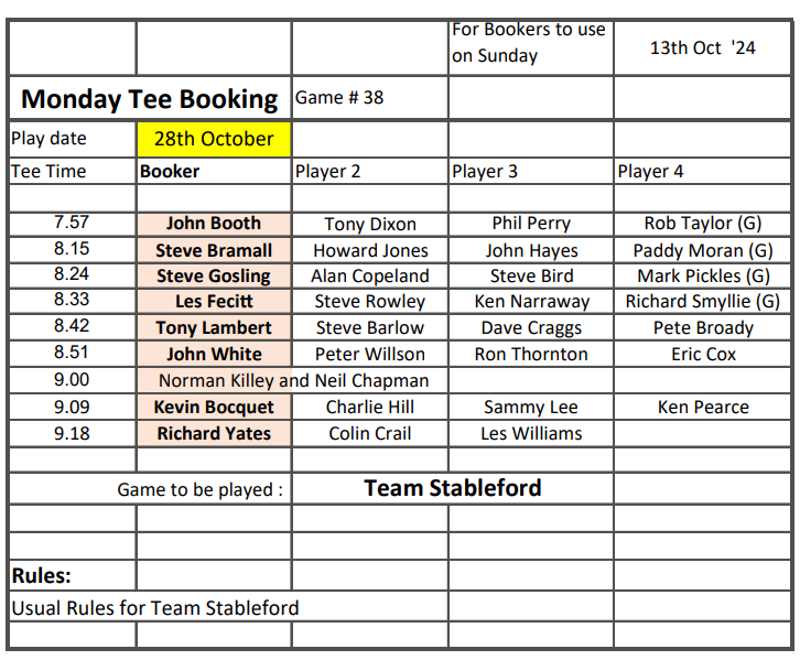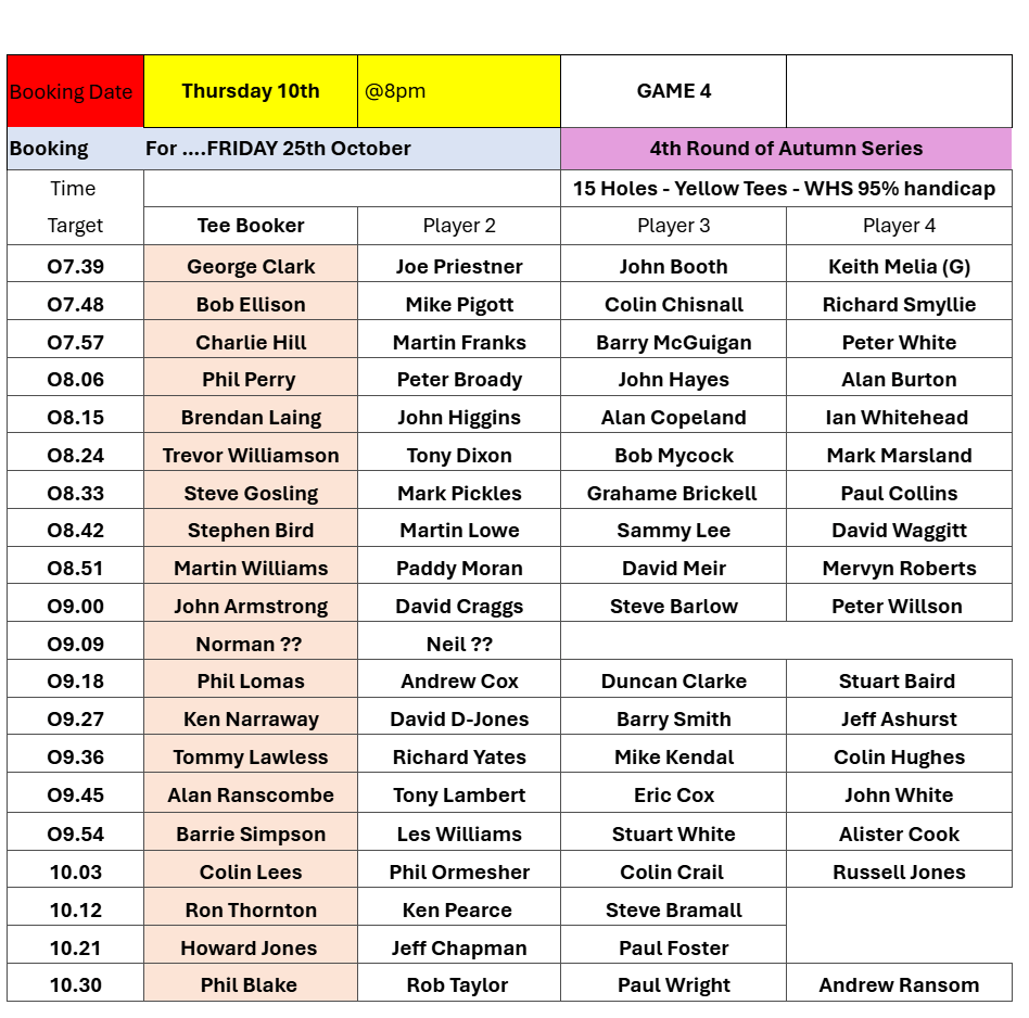 Tee-booking schedule for tomorrow (Thursday 10 October)