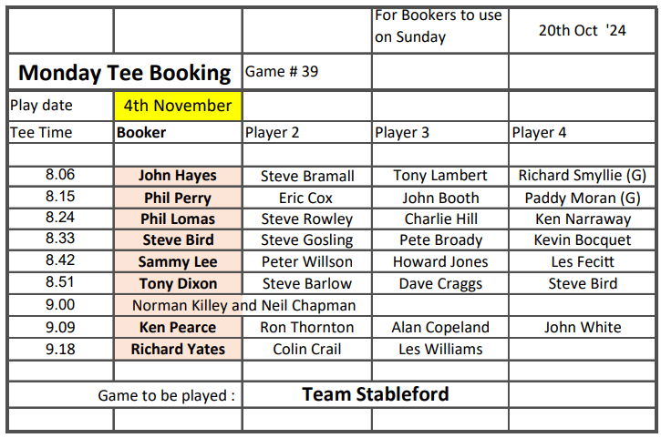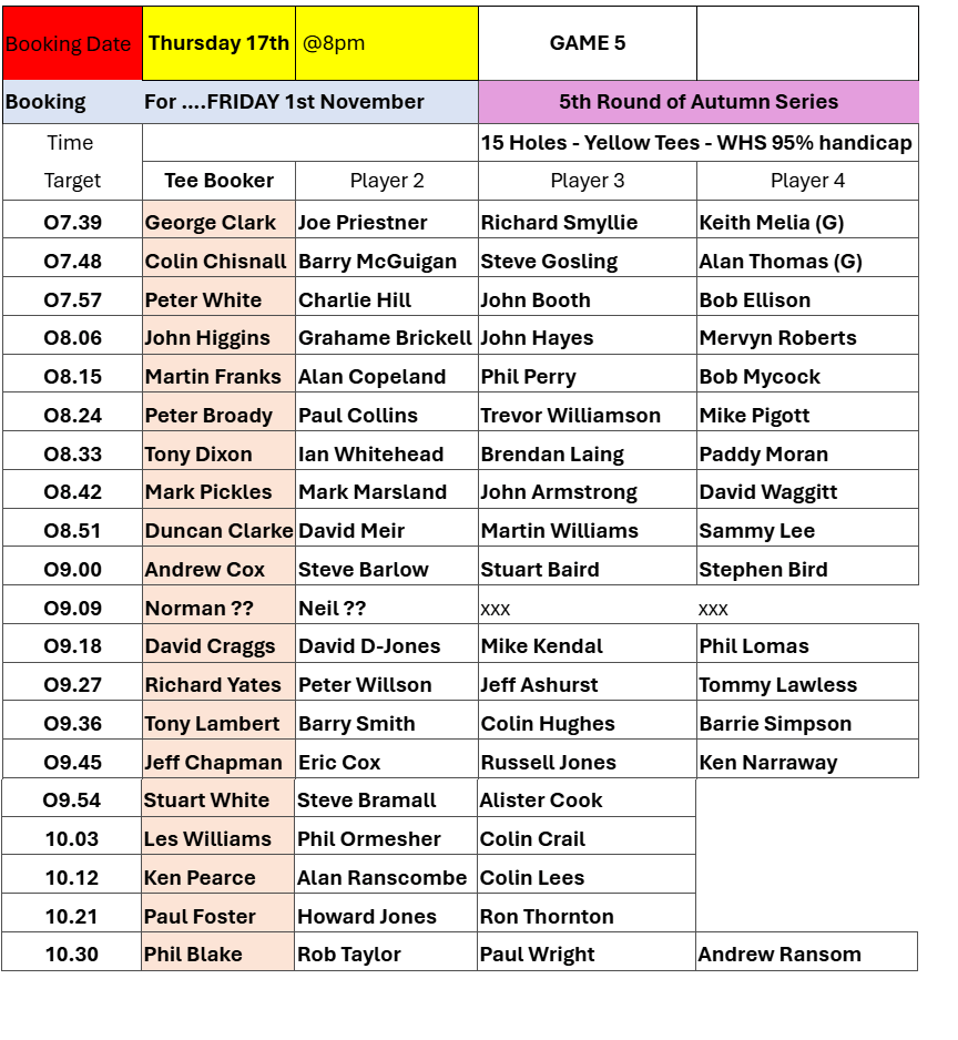 Tee-booking schedule for tomorrow (Thursday 17 October)