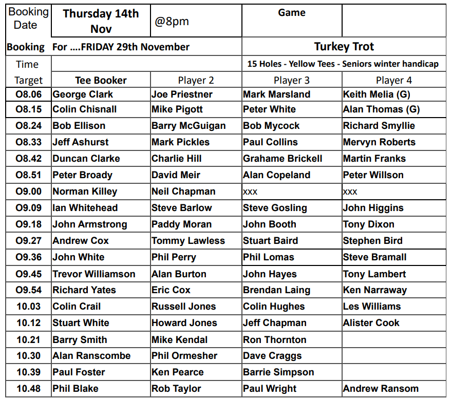 Tomorrow’s tee-booking schedule is for our Turkey Trot on 29th November. Cash prizes for Div 1 and Div 1 winners.