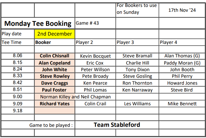 Tee-booking schedule for tomorrow – Thursday 14 November