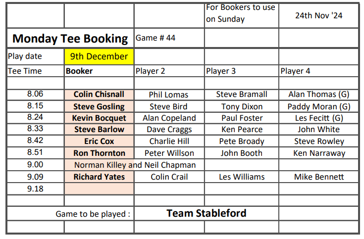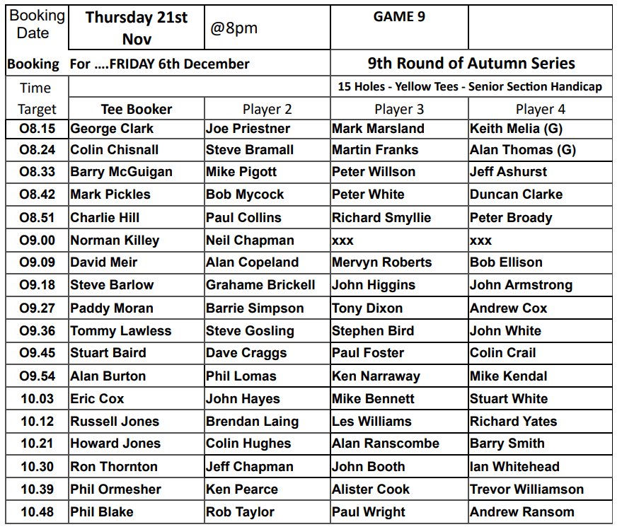 Tee-booking schedule for tomorrow (Thursday 21 November)