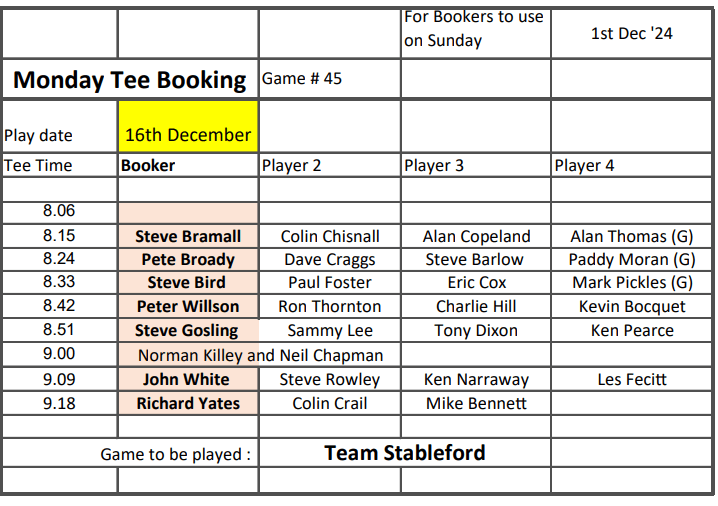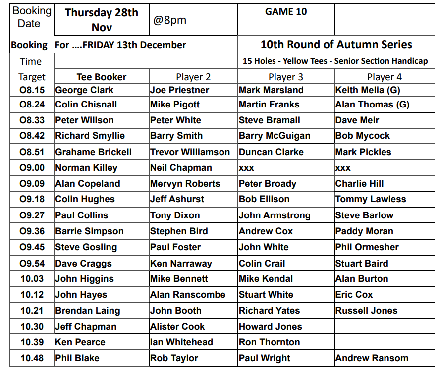 Tee-booking schedule for tomorrow (Thursday 28 November)