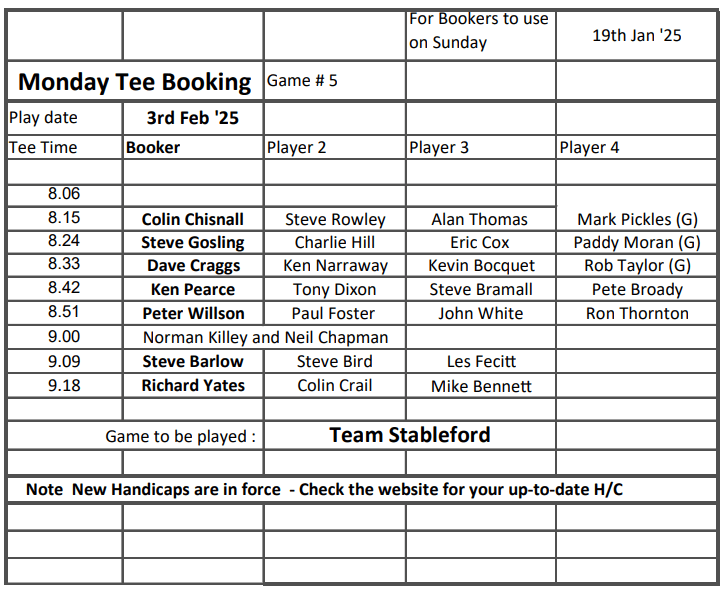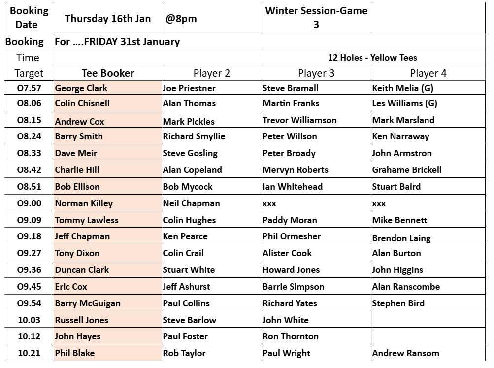 Tee-booking schedule for tomorrow (Thursday 16 January)
