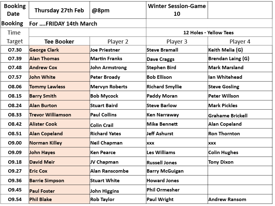 Tee-booking schedule for tomorrow (Thursday 27 Feb)