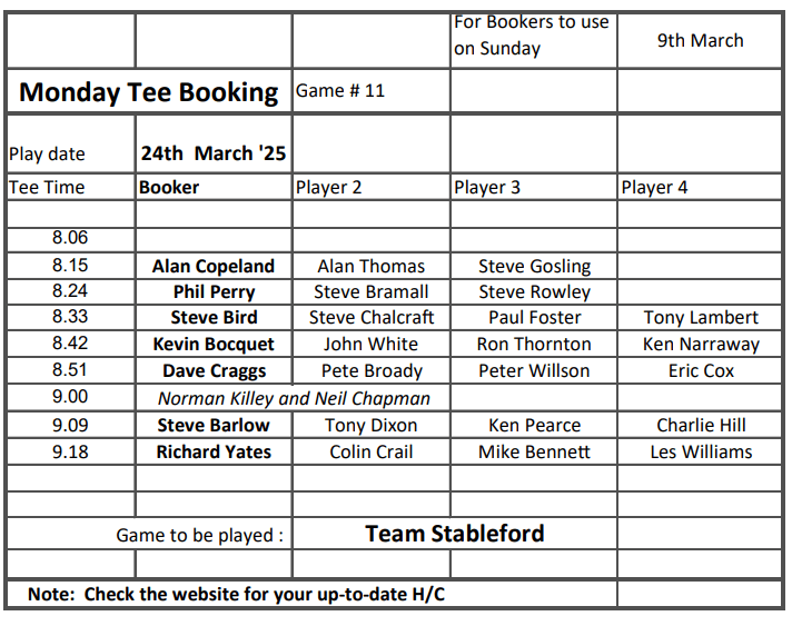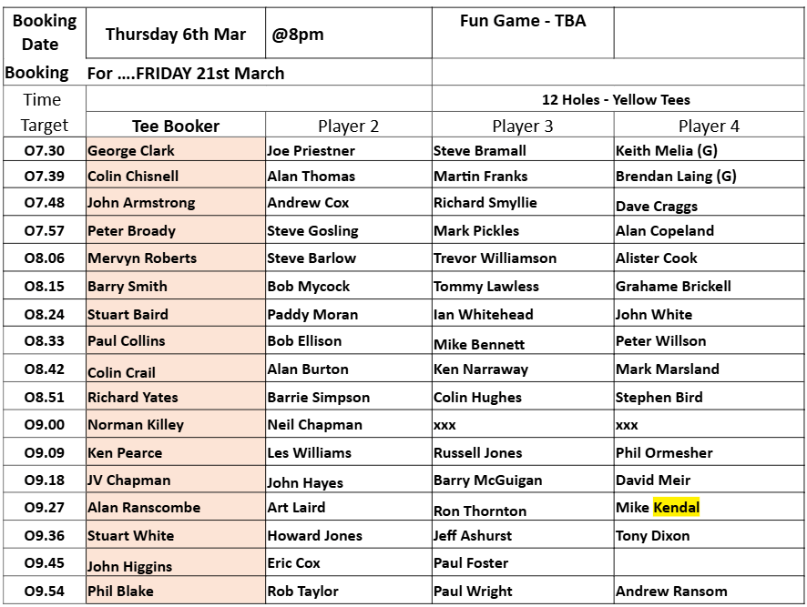 Tee-booking schedule for tomorrow (Thursday 6 March)