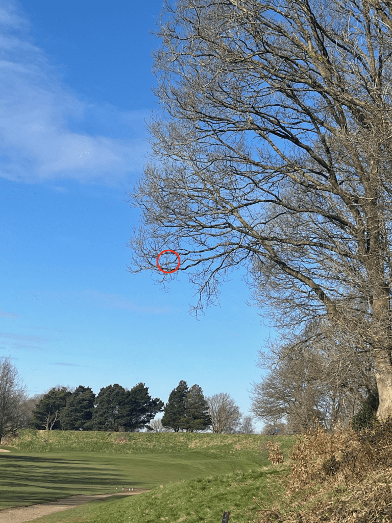 I think we’ve all hit balls into dense conifer trees, only for them never to come down. Last Friday Steve Gosling managed to keep his ball high up in some skinny bare twigs of the tree overhanging the 11th fairway! The gravity-defying ball was still there this morning (Wednesday). It’s becoming somewhat of a tourist attraction!