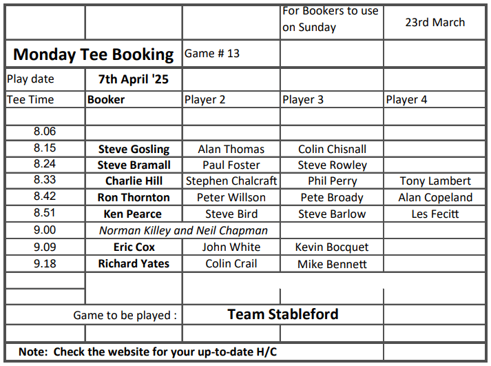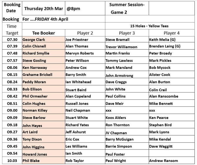 Tee-booking schedule for tomorrow (Thursday 20 March)