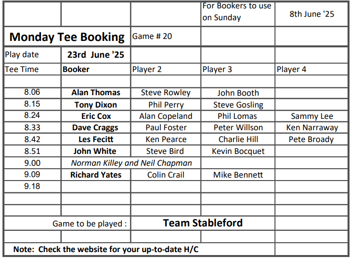 Happy Mondays tee-booking schedule for Sunday 8 June