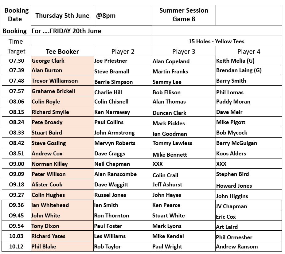 Tee-booking Schedule for tomorrow (Thursday 5 June)