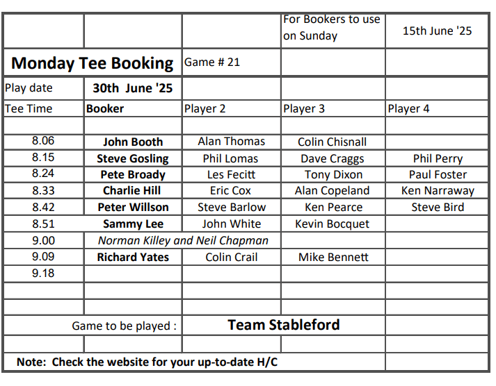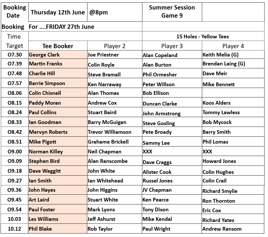 Tee-booking schedule for tomorrow (Thursday 11 June)