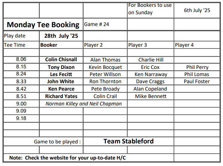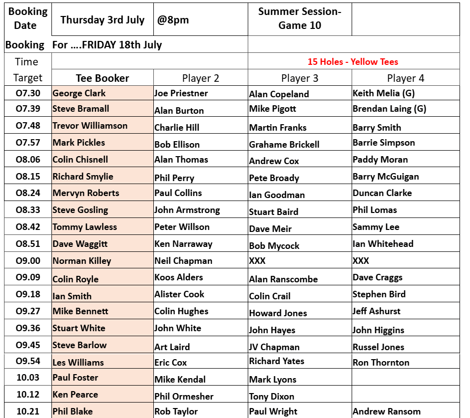 Tee-booking schedule for tomorrow – Thursday 3 July