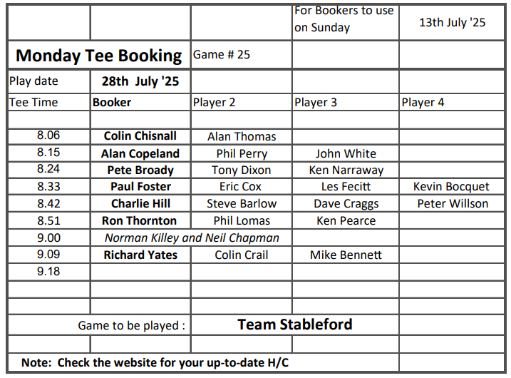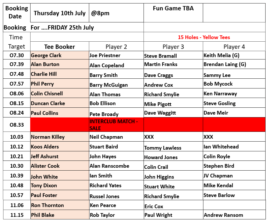 Please note that although Mike Kendal tries to accommodate requests for preferred tee times, he obviously needs to make adjustments when we have an interclub home match on Fridays, including Friday 25 July, when we invite Sale GC.