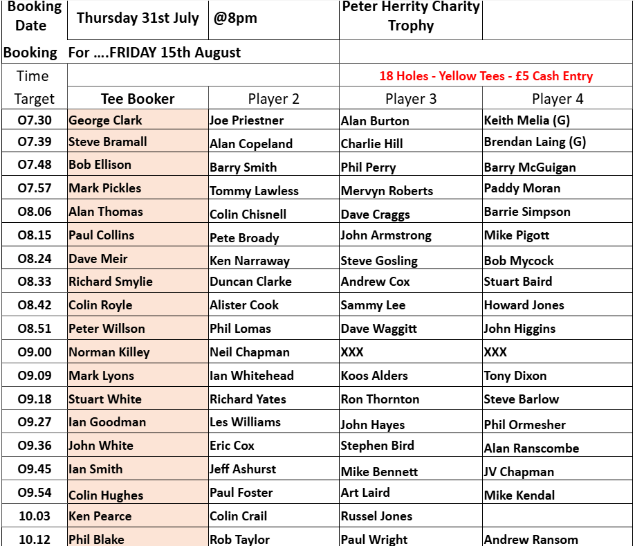 Tee-booking schedule for tomorrow (Thursday 31 July)