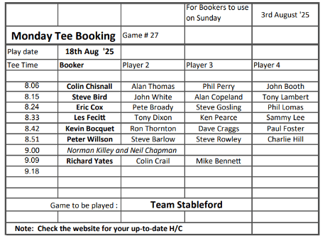 Happy Mondays tee-booking schedule for Sunday 3rd August